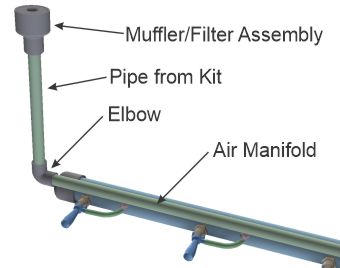 Assemble elbows and piping to your setup so that the 1/2" tubing will be above the water line and does not interfere with other components of your system. It is recommended that you dry-fit all these components together to ensure all the pieces are arranged properly. There is no need to cement the muffler assembly to the snorkle pipe since it is above the water line.