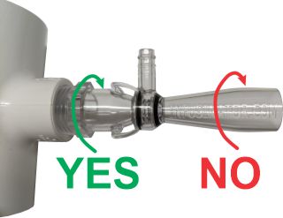 Carefully slide the nozzle section over the gaskets, while making sure the locking tabs do not hit against the base tabs. Important: Pushing the tabs so they snap over the base tabs will break them! Once the two sections are pushed together, carefully twist the two sections so the locking tabs latch behind the base tabs.