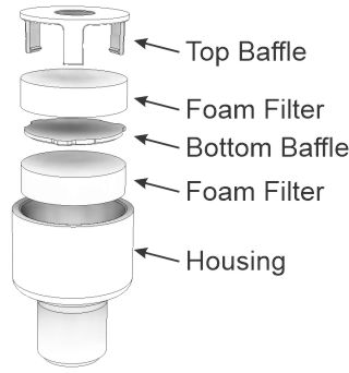 Periodically inspect and clean the filter. When removing the Top Baffle, the first Foam Filter and Bottom Baffle should come out as one unit and the other Foam Filter will remain in the Housing.