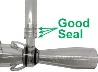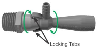 Carefully slide the nozzle section over the gaskets, while making sure the locking tabs do not hit against the base tabs. Important: Pushing the tabs so they snap over the base tabs will break them! Once the two sections are pushed together, carefully twist the two sections so the locking tabs latch behind the base tabs.